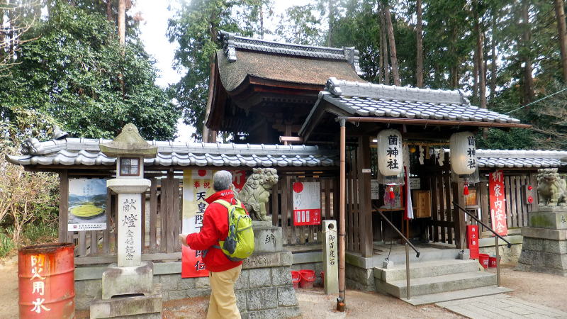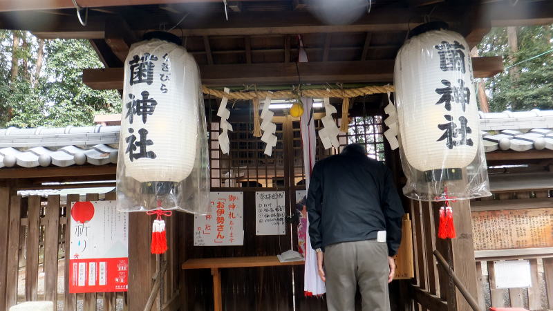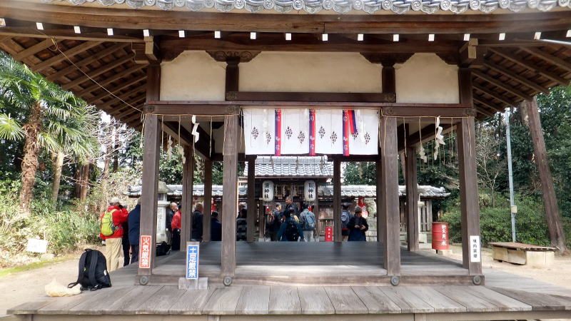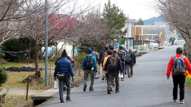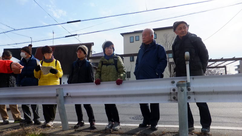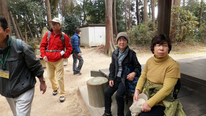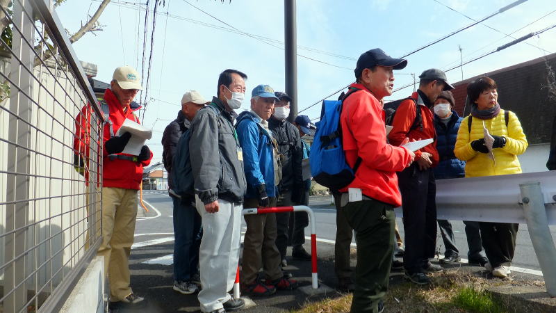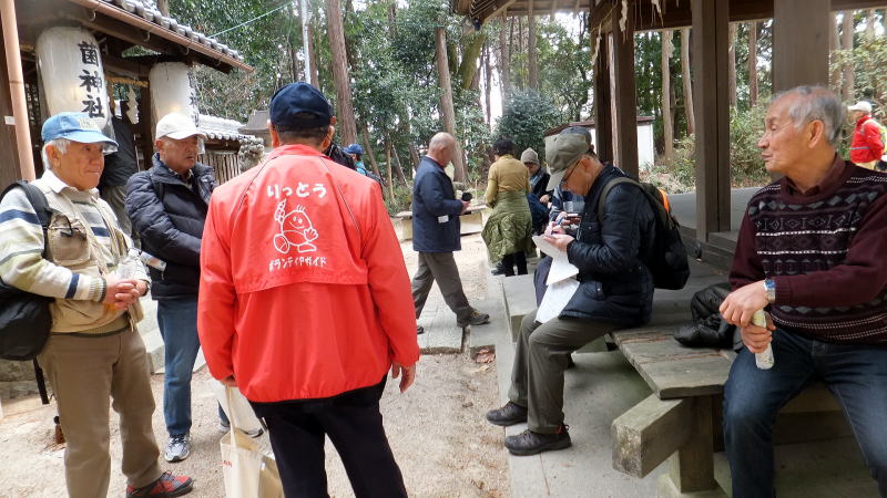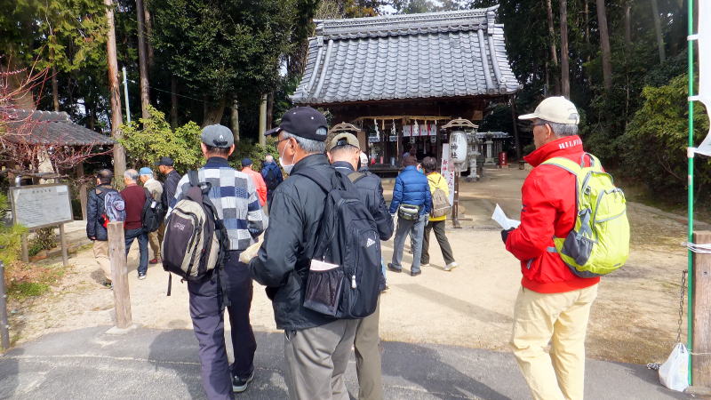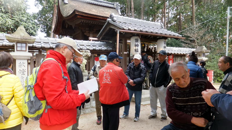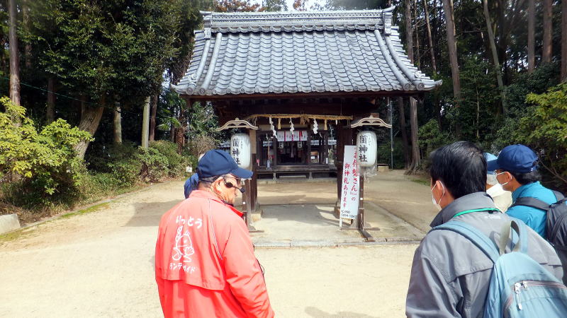 菌(くさびら)神社への道中での説明に聞き入っています