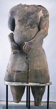 | 年代順に展示されているが、中国数千年を考えると、あまりにも永い、壮大な歴史となる。 会場最初にあった、小さな、石づくりの人形。当時は金属という物は無かった。 BC3500というから、5500年前の実物が今、目の前にあるのだ。 日本では、原始人の時代に。 |
